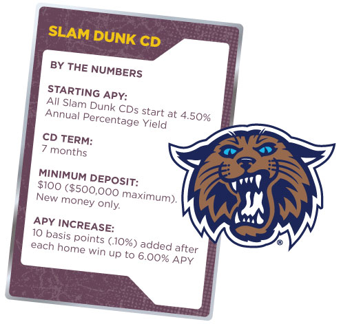 Nova fans! Show support for your Wildcats this season and boost your savings at the same time. Add a limited-time Slam Dunk Certificate of Deposit (CD)1 to your starting lineup and we’ll increase your savings rate each time the Villanova Wildcats Men’s Basketball team wins a home game2. The more the Wildcats win, the more you earn!